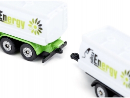 Kovový model tahače s cisternovým návěsem od značky Siku, délka přibližně 17 cm, měřítko 1:87. Tahač je vybaven čirými okny. Návěs je odpojitelný a má výklopné patky pro samostatné stání. Vh...
