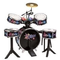 Reig Musicales dětská bicí souprava Golden Drums velká, 5 bubnů, činely, paličky, židle, pedál. Průměr velkého bubnu je 44 cm. Barva: hnědá.