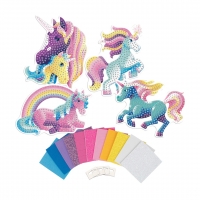 Obrázky z mozaiky s motivem jednorožců. 4 různé mozaikové vzory, 4 stojany, 1900+ samolepicích pěnových, třpytivých čtverečků v různých barvách a tvarech.