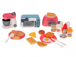 Sada na vaření: Dokonalý průvodce pro malé kuchaře! Co najdete v sadě: mikrovlnnou troubu, toustovač, mixér a široká škála doplňků, jako jsou kečup, zálivka, voda, džusy, mléko, vafle, grilo...