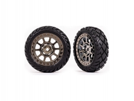 Kompletní zadní kola pro auta 1:10 (Bandit). Disk šedý/chromovaný. Pneumatiky Alias.