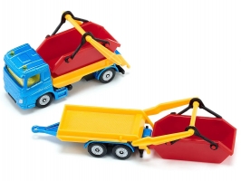 Kovový model nákladního auta s přívěsem a kontejnery, délka přibližně 15 cm. Model obsahuje čirá okna, majáčky, odpojitelný dvounápravový přívěs, sklopná ramena a dva červené kontejnery. Vho...
