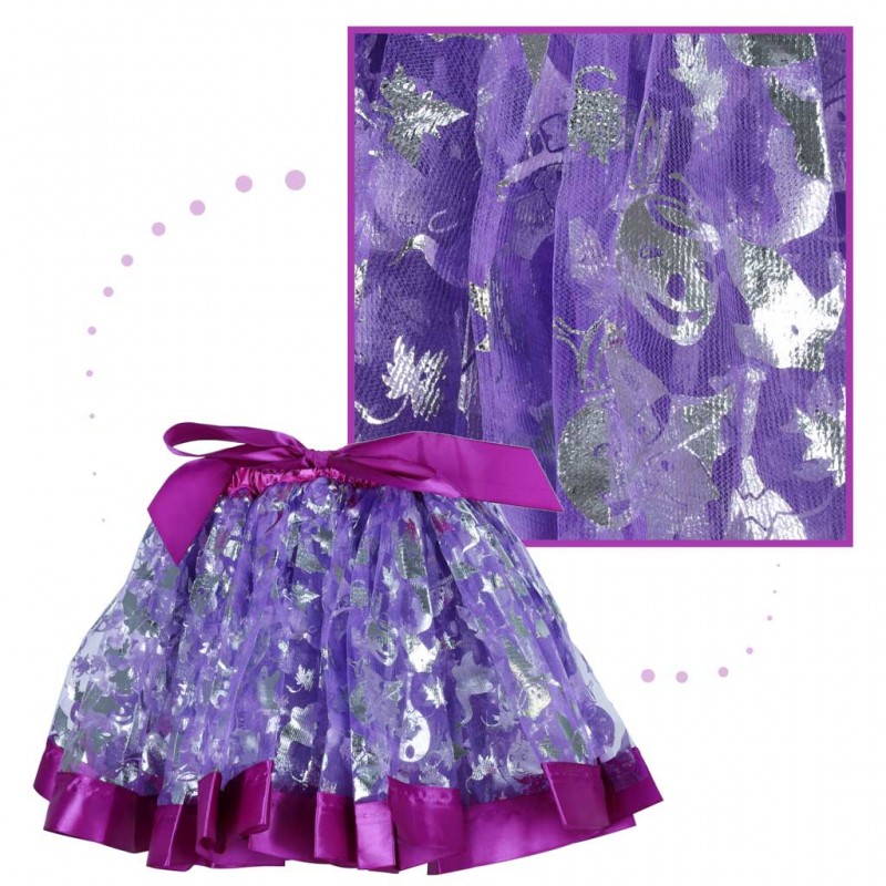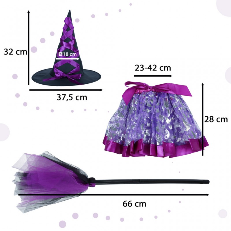 Kostým čarodějnice je ideální na maškarní ples, tematickou párty nebo Halloween. Obsahuje tylovou sukni, klobouk a koště. Akcenty kostýmu ve fialové barvě. Materiál: polyester, bavlna, plast. Šířka sukně: 23-42 cm.