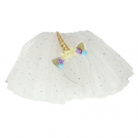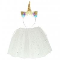 Karnevalový kostým čelenka s jednorožcem a bílá princezna sukně pokrytá třpytivými hvězdami.