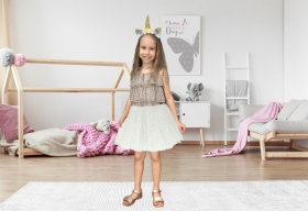Oblíbený střih sukně - balerína je snem každé malé princezny. Sukně z polyesteru, v pase všitá ą Sukně je vyrobena z polyesteru a má všitou gumu v pase, díky které se snadno přizpůsobí velikosti dítěte. Celá je pokryta flitry ve tvaru hvězd - na vlastní kůži vypadá napínavě.