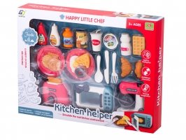 Sada na vaření: Dokonalý průvodce pro malé kuchaře! Co najdete v sadě: mikrovlnnou troubu, toustovač, mixér a široká škála doplňků, jako jsou kečup, zálivka, voda, džusy, mléko, vafle, grilované kuře, croissant, a mnohem více.