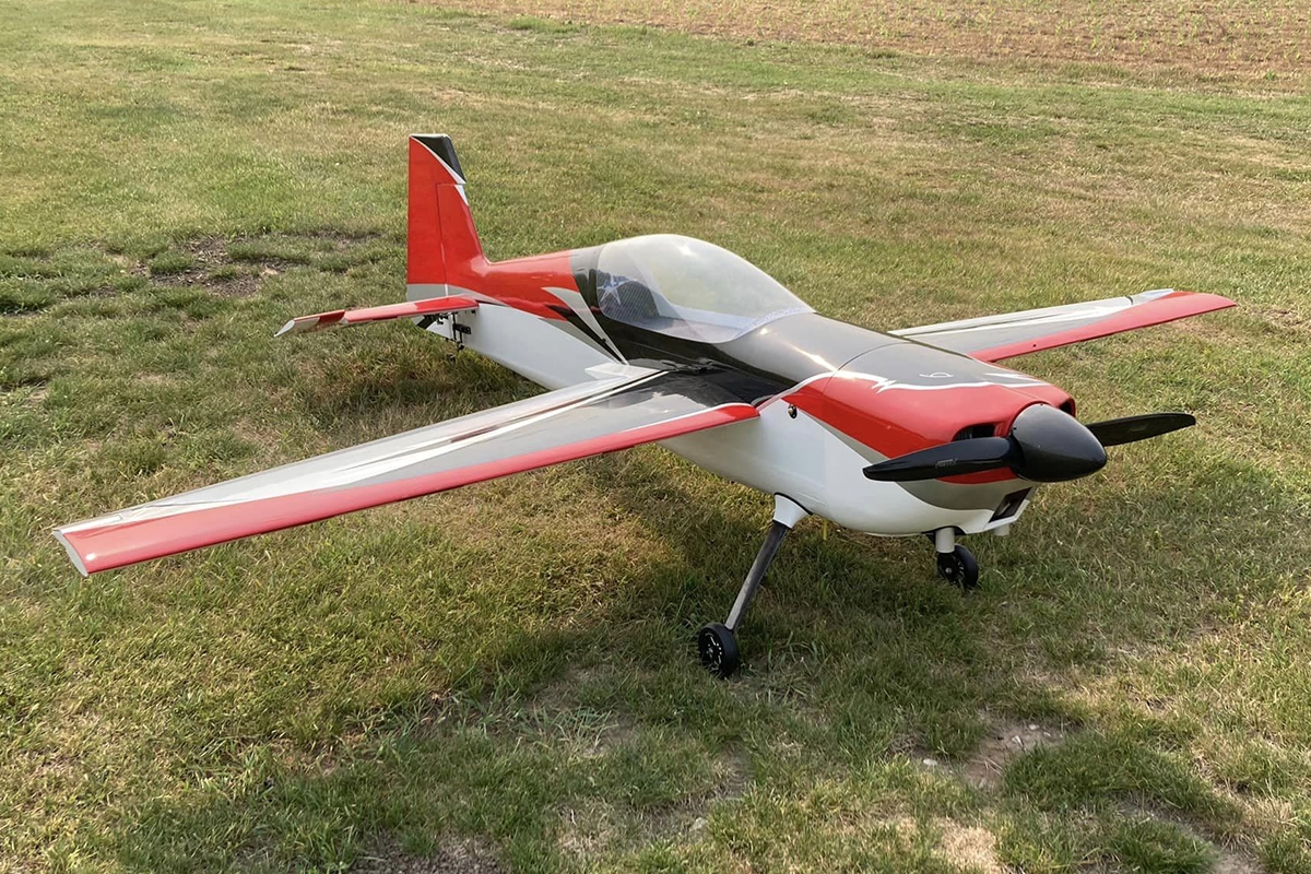 Sportovní polomaketa akrobatického letadla pro pohon benzínovým motorem 100-130 ccm pro zkušené piloty pro létání klasické přesné i extrémní 3D akrobacie.Trup modelu je klasické konstrukce z překližkových a balsových laserem vyřezávaných dílů vyztužených Kevlarem® a uhlíkem s odnímatelným laminátovým motorovým krytem a odnímatelnou horní částí trupu s kabinou pro dokonalý přístup k pohonnému systému a RC vybavení. Motor se upevňuje v zadní montáži na překližkové krabicové lože; pro případnou montáž laděného tlumiče výfuku je připraven tunel na spodní straně trupu.Dvoudílné křídlo se souměrným profilem (poloviny se nasouvají z boku na uhlíkovou trubkovou spojku a zajišťují šrouby) je rovněž klasické konstrukce s celobalsovým tuhým potahem. Křidélka s velkou plochou jsou ovládána 2 páry serv.Ocasní plochy jsou lehké celobalsové konstrukce, VOP je dvoudílná spolovinami stabilizátoru nasouvanými na uhlíkovou trubku. Poloviny výškovky jsou ovládány servy uloženými ve vodorovném stabilizátoru s krátkými přímými táhly. Směrovka je ovládána pomocí lankového náhonu. Celý model je potažen nažehlovací fólií ULTRACOTE® (to je obchodní značka používaná v USA pro dobře známé fólie Oracover®).Podvozek je ostruhového typu s uhlíkovými hlavními nohami, koly s laminátovými kryty a drátovou ostruhou s uhlíkovou konzolí spřaženou se směrovkou.Pro pohon budete potřebovat benzínový motor 100-130 ccm (např. GP-123).Pro ovládání modelu vyhoví nejméně devítikanálová počítačová RC souprava – možnost přesného nastavení „párových“ serv a naprogramování dvojích a exponenciálních výchylek ve správné velikosti je pro létání akrobacie – klasické přesné i extrémní 3D – zásadní.Serva vyhoví rychlá a velmi silná ve standardní velikosti – např. Futaba S9177SV, Hitec Hitec HS-7950TH, D980TW nebo HSB-9381TH a jedno standardní servo pro ovládání plynu.
