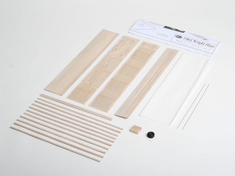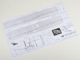 Pozor - na spodní straně krabice jsou natištěny šablony pro zhotovení přípravku pro ustavení křídel do správné vzájemné polohy před nalepení vzpěr. A také figurka ležícího "bratra Wrighta", kterou model oživíte.
