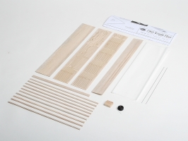 Stavebnice obsahuje: balsové laserem vyřezávané díly, balsové nosníky, předseknuté díly stojánku, potahový papír, šňůru na znázornění výztužných lanek, stavební plán