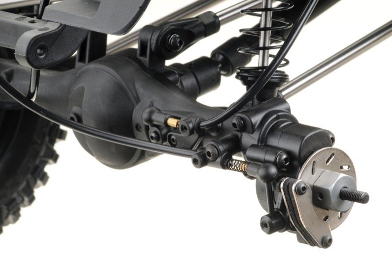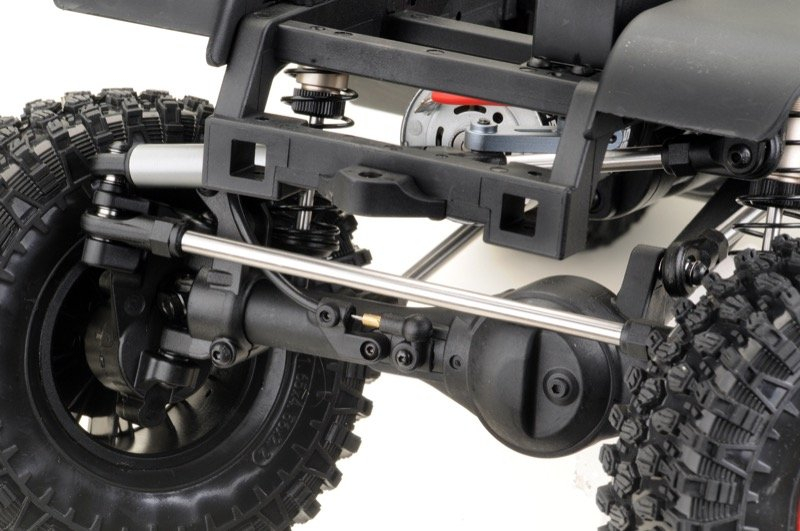 Nová generace expedičního speciálu Absima 1:10 s excelentními jízdními vlastnostmi. Model má pohon všech kol, je vybaven portálovými nápravami pro maximální průjezdnost terénem. Podvozek má díky novému umístění motru, převodovky a baterie velmi nízké těžiště, což výrazným způsobem vylepšuje jízdní vlastnosti. Dvoustupňová převodovka, uzávěrky diferenciálů, nainstalované LED osvětlení - vše je ovládané z jedenáctikanálového vysílače a ještě vám zůstanou volné kanály na ovládání případných dalších funkcí (naviják, majáky a pod.). Pevný plastový rám s rozvorem 325mm je vybaven plastovými podběhy, které výrazně omezují pronikání nečistot na šasi. Nápravy jsou zavěšené na klasickém 4-linku (kovové linky). Poloosy jsou vybaveny CVD klouby, přední kola mají úhel zatočení 45° na každou stranu. Měkké pneumatiky s velkým gripem jsou nalepené na 2.2 plastových diskách. Tlumiče jsou olejové, kovové. Všechny převody jsou kovové (kromě velkého převodového kola u pastorku) a komplet zakrytované. Pastorek s převodovým kolem mají modul 32dp. Silné servo řízení s tahem 25kg s kovovými převody ovládá přední kola přes účinný tlumič řízení, toto řešení výrazně prodlužuje životnost serva a snižuje nároky na jeho výkon (tah). Elektromotor je stejnosměrný typ 550 s velkým točivým momentem. Regulátor je integrovaný v přijímači, možné zatížení je až 60A, výkonný BEC 5A, bez ochrany proti vodě a vlhkosti. Konektor na regulátoru je D-Dean. Karosérie je vybavena mnoha maketovými doplňky. Specialitou tohoto modelu je funkce DIG, která při zatáčení v náročném terénu může mechanicky uzavírat/brzdit zadní nápravu a tím výrazně zmenšovat poloměr zatáčení. Na rozdíl od běžných systémů DIG zde nebrzdí obě zadní kola, ale pouze jedno ve vnitřku zatáčky a tím dokáže ještě více snížit poloměr zatáčení a zvýšit manévrovací schopnosti modelu na omezeném prostoru.