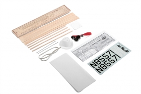 Stavebnice obsahuje: balsové laserem vyřezávané díly, balsové nosníky, vakuově lisované maketové díly (kryt motoru...), plastovou vrtuli s hřídelí a hlavicí, gumový svazek (guma 5x1mm), plastová kola, ocelovou strunu na podvozek a další drobné díly, plastová kola, potahový papír, aršík mokrých obtisků, stavební plán.