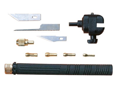 AMATI Action Cutter s příslušenstvím A - byla navržena pro drobné ruční práce. Nylonová rukojeť pojme čepele nožů, malé pilky a dokonce i ty nejmenší vrtáky, což z ní dělá nástroj, který potřebuje každý modelář. Sada dále obsahuje dva nože, pilový list, sklíčidlo se 4 vložkami a minisvěrák k připevnění na rukojeť.