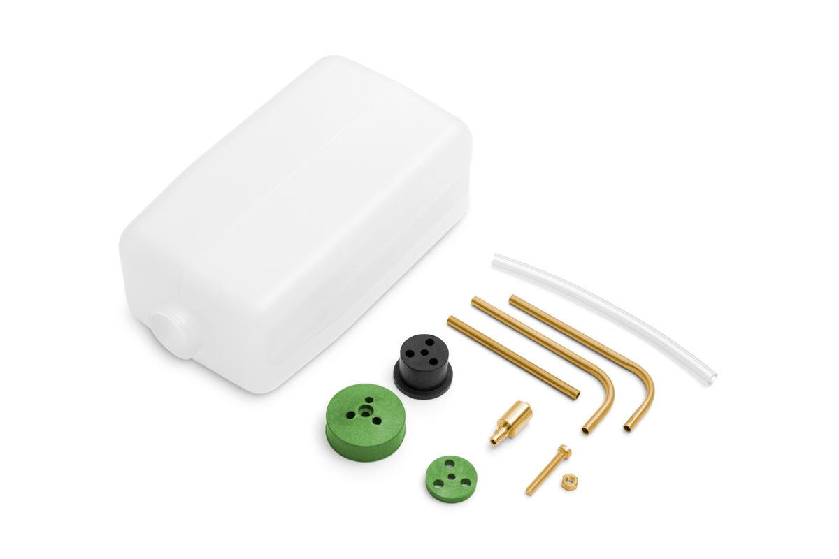 Lehká ale pevná nylonová nádrž 340 ml pro žhavící palivo s odolným víčkem, gumovou zátkou a opěrnou deskou. Předohýbané mosazné fitinky a sací závaží, silikonová hadička. Rozměry (bez hrdla a víčka): 121x69x48 mm, hmotnost: 47g.