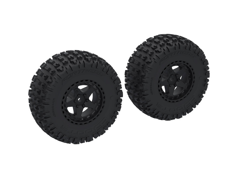 Náhradní díl pro RC modely auta Arrma 1:10 disk černý 2.2/3" s pneu dDboots Fortress SC (2). Rozměr ⌀56/76x42 mm. Unašeč je šestihran 14 mm. Pneumatiky 4.1" (104mm). Větrací otvory v pneumatikách. Nalepené pneumatiky.