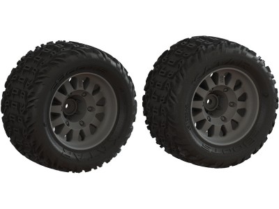 Náhradní díl pro RC modely auta Arrma Mega 550: kolo s pneu dBoots Katar (2). Rozměry ⌀115x52 mm. Unašeč je šestihran 14 mm. Pneumatiky 2.8" dBoots Katar.