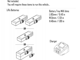 Pro zprovoznění modelu jsou potřeba 4x AA baterie do vysílače, pohonný akumulátor a adekvátní nabíječ na pohonný akumulátor.