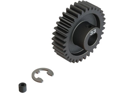 Arrma ocelový pastorek 33 zubů, modul M1, otvor Safe-D8. Otvor ve tvaru 'D' odpovídá profilu hřídele motoru s hřídelí 8mm a drážkou, proto se nemůže pastorek na hřídeli protočit. Stavěcí šroub - M4 x 4mm, segrovka 6mm. Precizně vyrobený široký profil zubu pro hladký chod.
