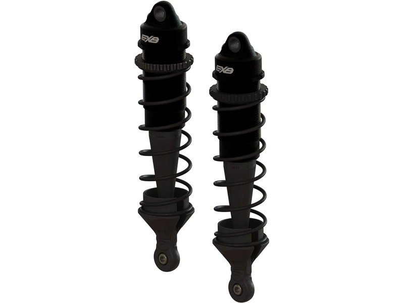 Arrma tlumič hliníkový sestavený (2): vrtání 16mm, délka 117mm, píst 8x1.2mm, olej 1300cSt, pružina: 1,21N/mm, pístnice 4mm. Černé eloxování. Nastavovací matice předpětí pružin.
