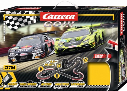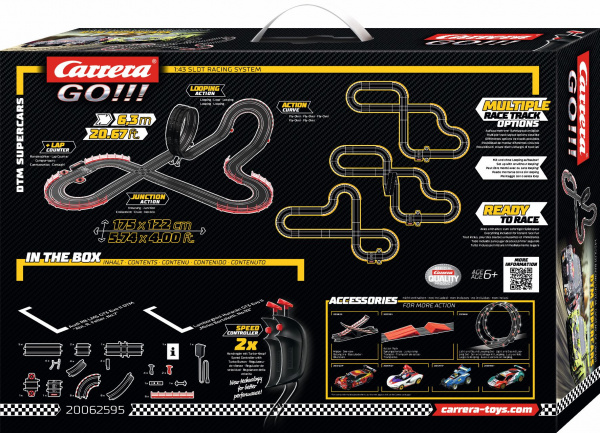 Autodráha Carrera GO!!! dlouhá 6,3m s auty série GT3 Audi R8 LMS a Lamborghini Huracán obsahuje křižovatku, rovinky, zatáčky, klopenou zatáčku, looping, díl s počítadlem kol a další díly. Můžete si sestavit další různé trati podle své fantazie.