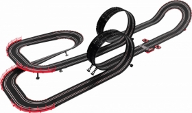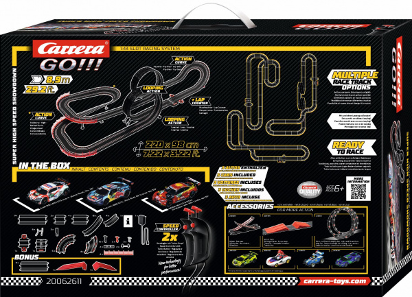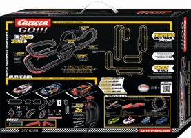 Autodráha Carrera GO!!! dlouhá 8,9m s auty BMW M4, Ferrari 488, Audi R8 LMS, obsahuje přemostění, rovinky, zatáčky, kolmou stěnu, klopenou zatáčku, looping, díl s počítadlem kol a další díly. Můžete si sestavit další různé trati podle své fantazie.