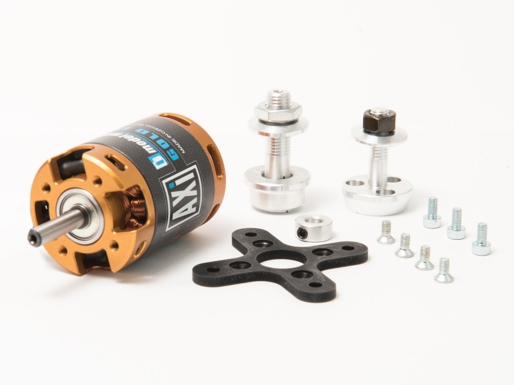 Sada motoru obsahuje: střídavý motor AXI 2826/8 V2 s kabely, kleštinový unašeč pro pevnou vrtuli, sadu pro zadní montáž, návod.