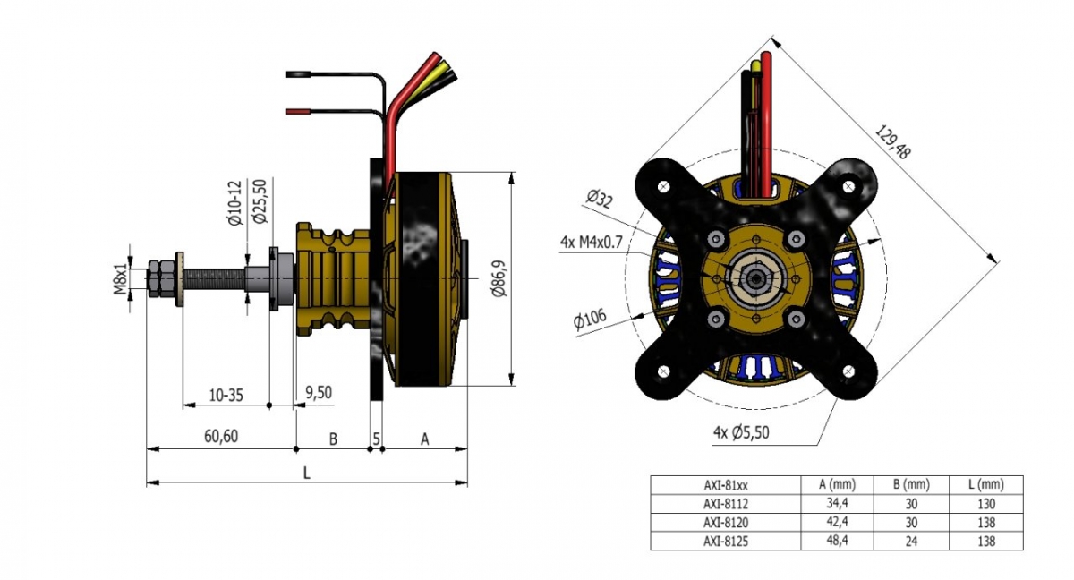 Střídavé elektromotory řady AXI 8112/xx V2 a 8120/xx V2 s rotačním pláštěm, neodymovými magnety a širokým spektrem použití jsou vhodné pro pohon velkých motorových a akrobatických modelů o hmotnosti 5000 až 10000g. Nový motor AXI 8112/xx V2 byl navržen pro napájeni 8-12s Lipol pro 3D modely až 4500g akrobatické modely až 6000g. Výkonnější řada motorů AXI 8120/xx V2 je určena pro 3D modely až do 8000g, motorové akrobatické modely do 10000g a pro obří realisticky létající modely o hmotností do 15000g. Uložení kalené hřídele ve třech kvalitních kuličkových ložiskách zajišuje motorům výbornou mechanickou odolnost a dlouhou životnost. Motory řady AXI 81xx V2 lze montovat na přepážku za přední část, nebo za speciální středové uchycení. Motory jsou dodávány včetně telemetrie.