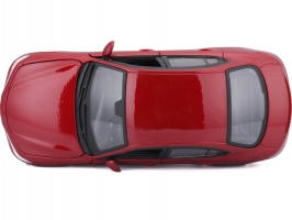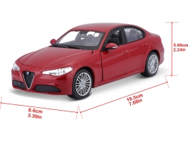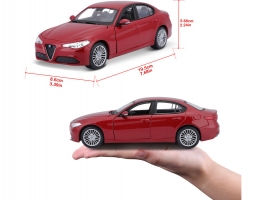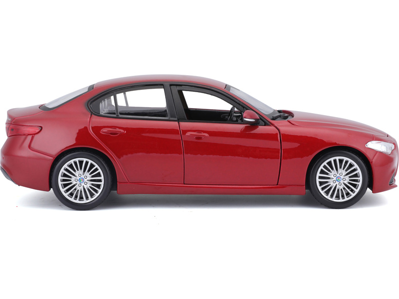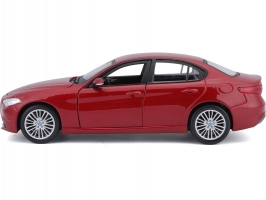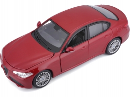 Kovový model auta 1:24 Bburago 18-21080 Alfa Romeo Giulia z roku 2016, nejen pro sběratele. Má otevírací dveře a kapotu. Barva modelu je červená metalíza a je přibližně 18 cm velký.