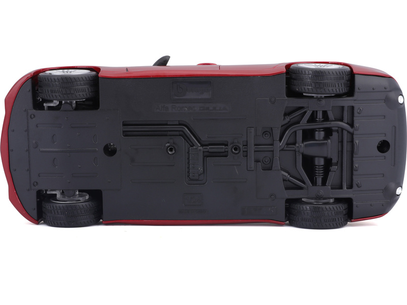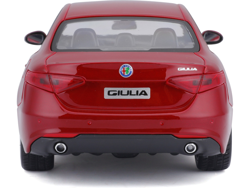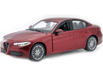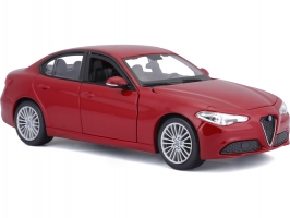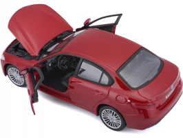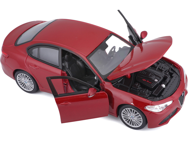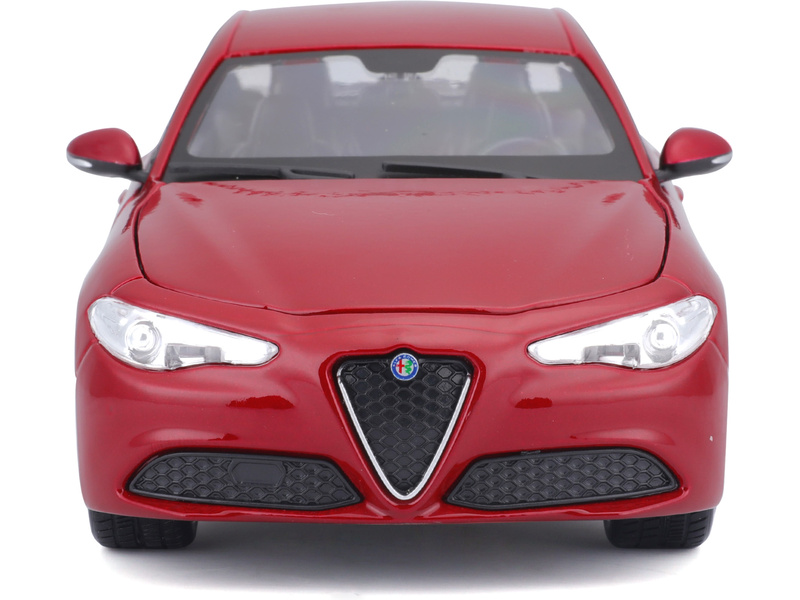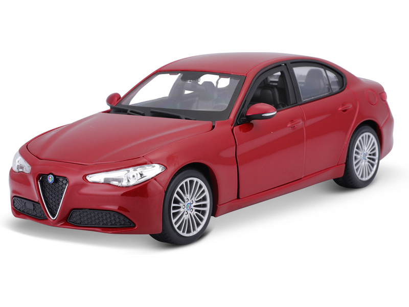 Kovový model auta 1:24 Bburago 18-21080 Alfa Romeo Giulia z roku 2016, nejen pro sběratele. Má otevírací dveře a kapotu. Barva modelu je červená metalíza.