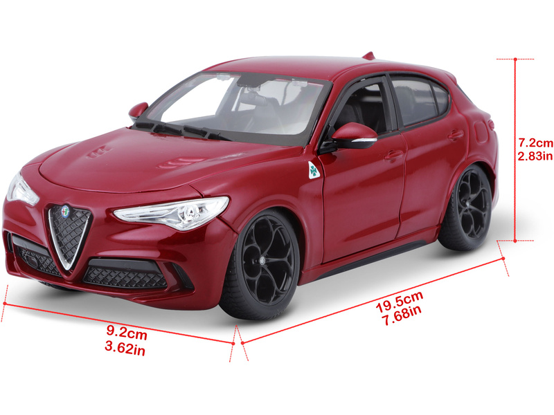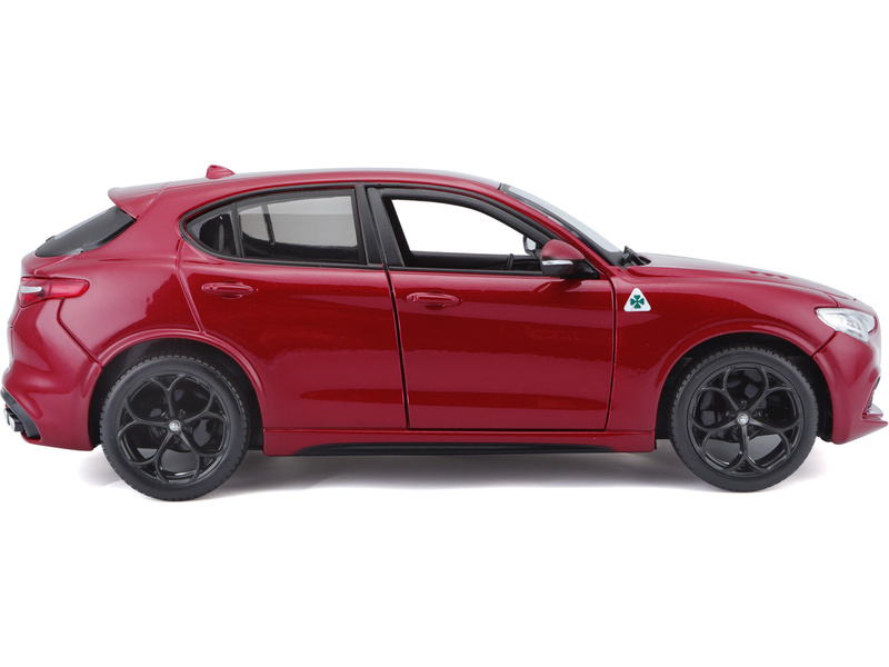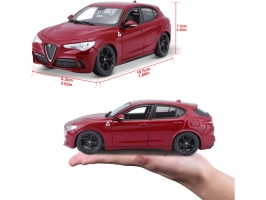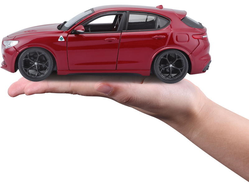 Kovový model auta 1:24 Bburago 18-21086 Alfa Romeo Stelvio, nejen pro sběratele. Má otevírací dveře a je v detailním provedení. Barva modelu je červená a je přibližně 18 cm velký.