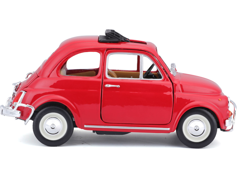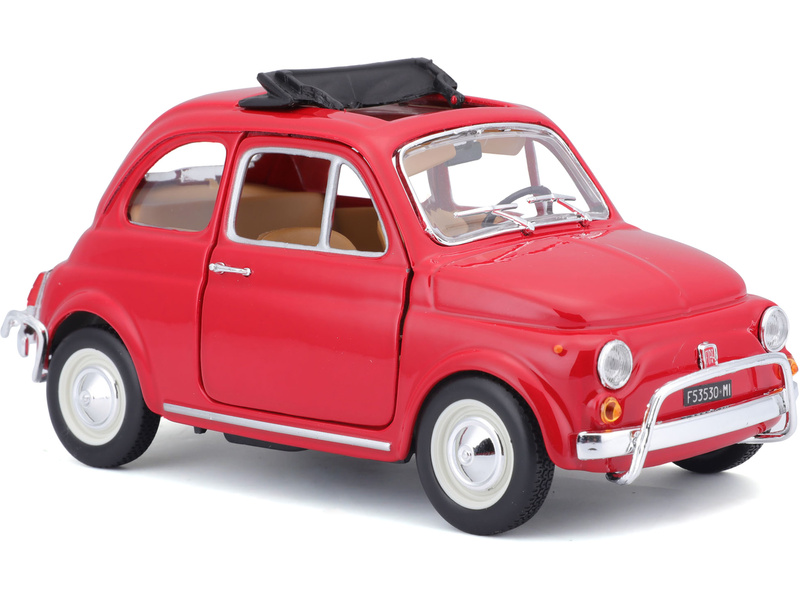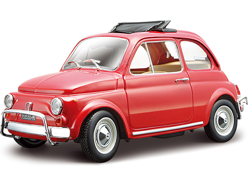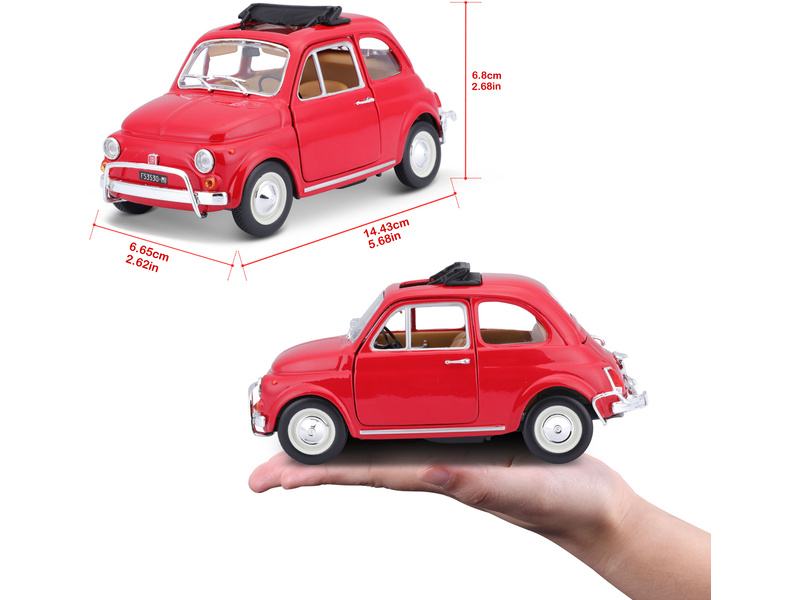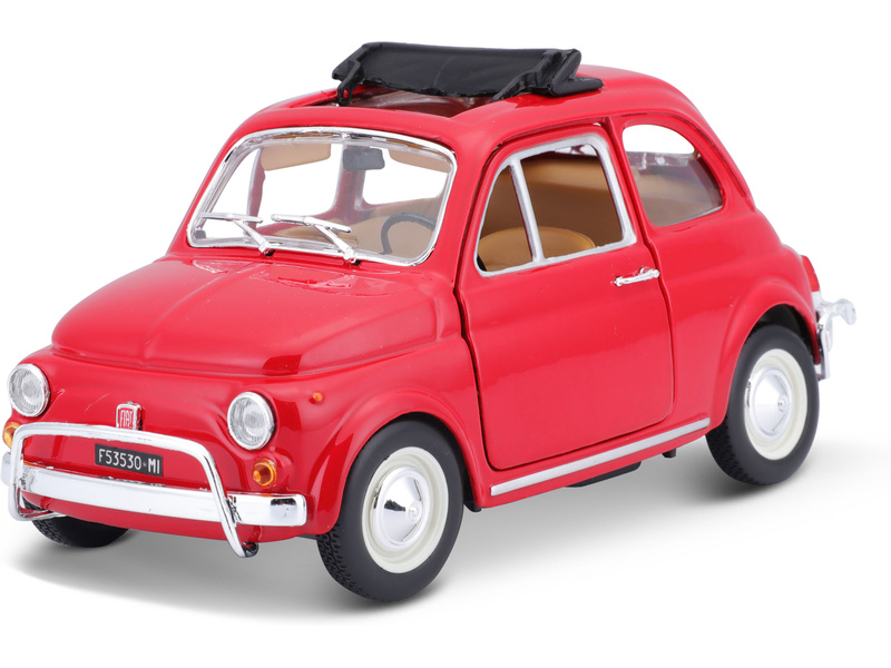 Kovový model auta 1:24 Bburago 18-22099 Fiat 500L z roku 1968 nejen pro sběratele. Má otevírací dveře a kapotu, natáčení kol volantem je plně funkční. Barva modelu je červená.