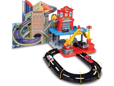 Balení obsahuje: 1 policejní a červené autíčko ( přibližně 10 cm velké ), 2 základny na každé patro, dekorační obrázek pozadí hořícího domu, výtah, 3 oblouky na vytvořen silničního okruhu, hasičskou stanici, požár na hašení, sjezd pro auta, stříkací sanice ( která opravdu funguje ), nálepky.