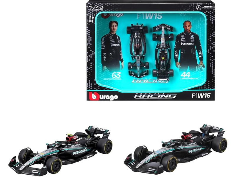 Sada 2 kovových modelů formulí 1:43 Bburago 18-38115 Mercedes-AMG F1 W15 nejen pro sběratele. Velikost formule je cca 10 cm.
