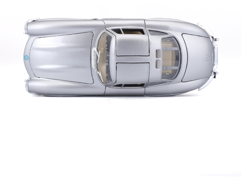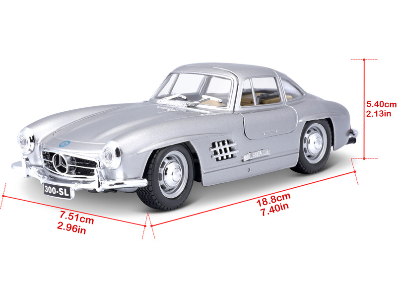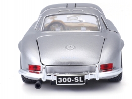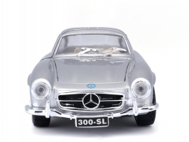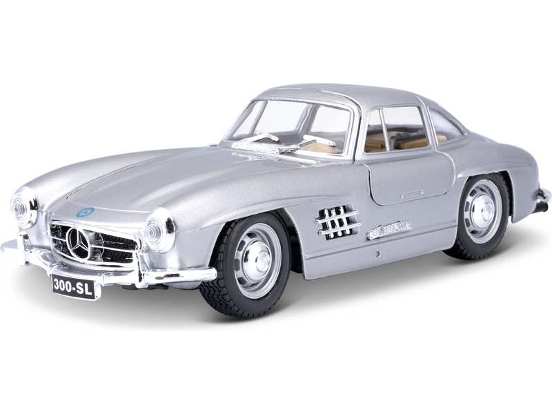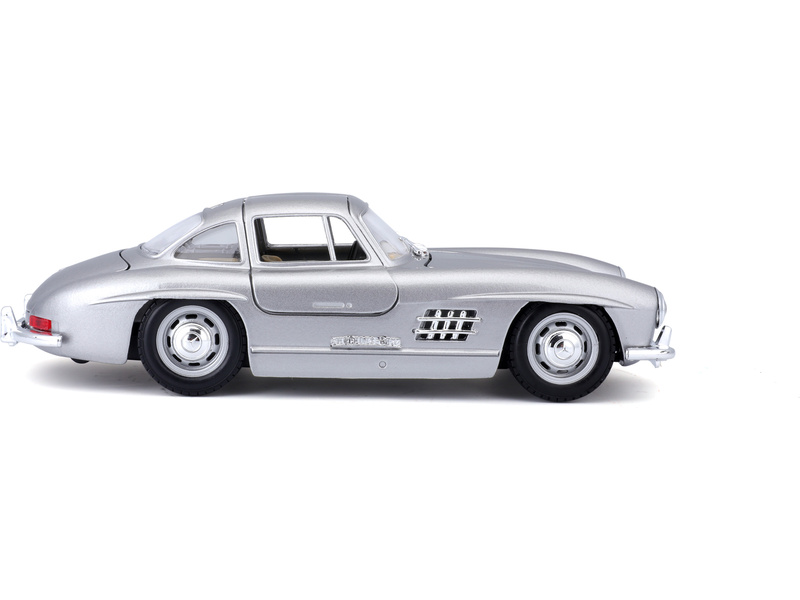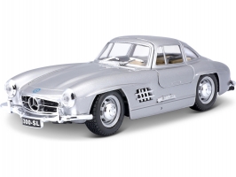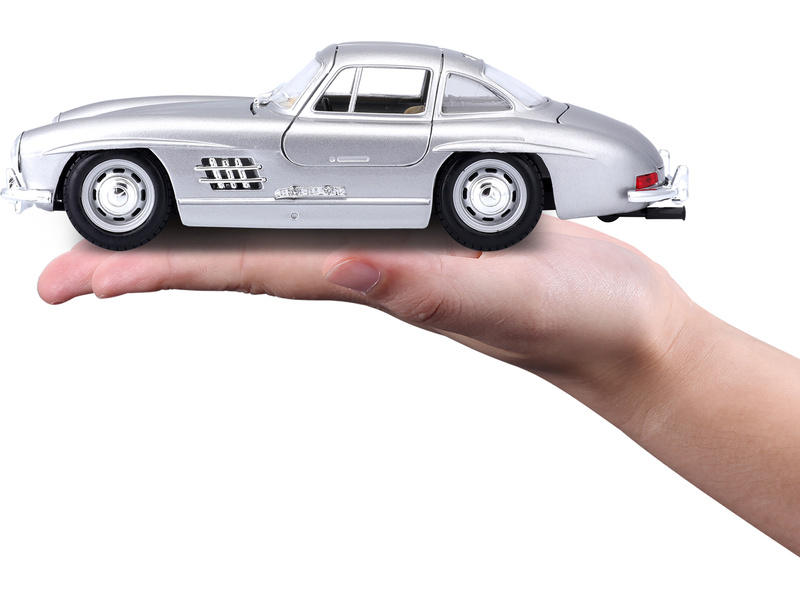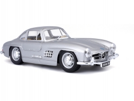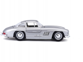 Kovový model auta 1:24 Bburago 18-22023 Mercedes-Benz 300 SL (1954) nejen pro sběratele. Má otevírací dveře a kapotu, natáčení kol volantem je plně funkční. Barva modelu je stříbrná a je přibližně 18 cm velký.