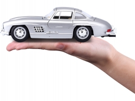 Kovový model auta 1:24 Bburago 18-22023 Mercedes-Benz 300 SL (1954) nejen pro sběratele. Má otevírací dveře a kapotu, natáčení kol volantem je plně funkční. Barva modelu je stříbrná.