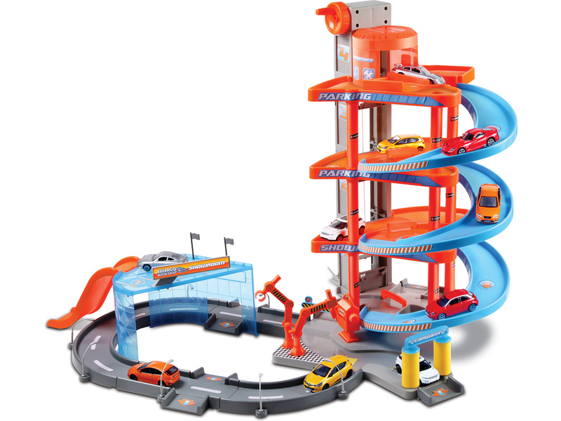 Garáž vyrobenou z atraktivně probarvených plastových dílků lze lehce složit a rozložit. Pak už stačí pouze zapojit vlastní fantazii a začít zažívat nekonečnou zábavu a dobrodružství. Auto je možné si vyzvednou ze showroomu, spustit jej po svažující se silnici vedoucí z každého patra garáže a nakonec projet automyčkou!