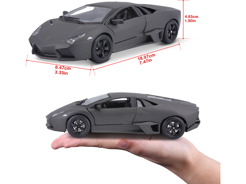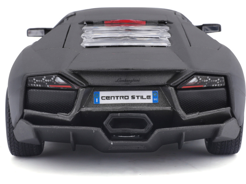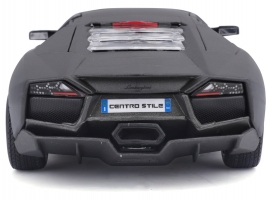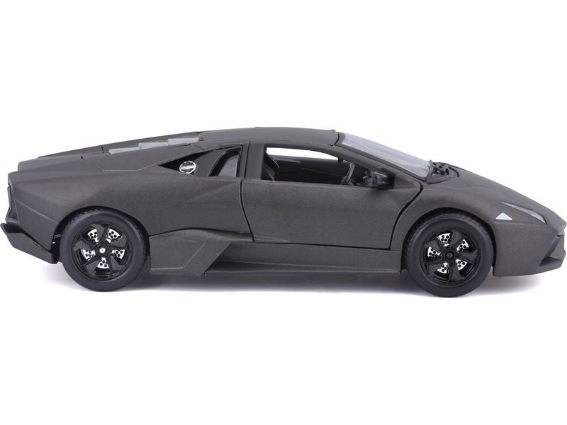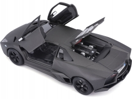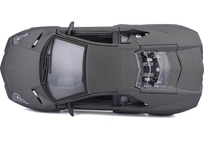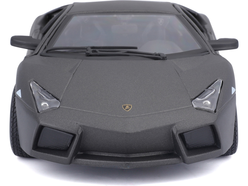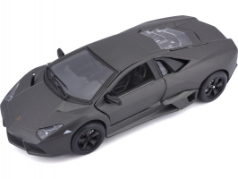 Kovový model auta v měřítku 1:24 Bburago 18-21041 Plus - Lamborghini Reventón v šedé metalíze. Model má otevírací dveře a kapotu, natáčení kol volantem je plně funkční. Auto je přibližně 19 cm velké.