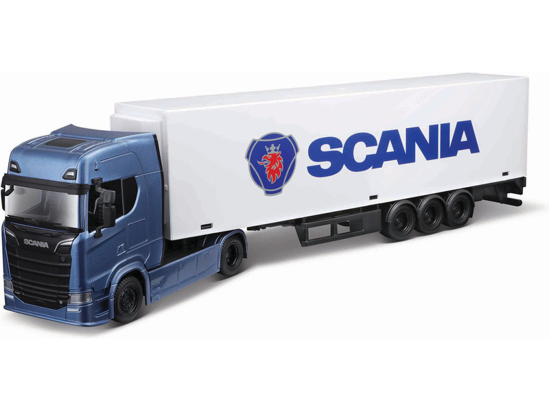 Kovový model Bburago 18-31468E - Scania 770 S s návěsem Scania v měřítku 1:43. Je vyroben z kovových a plastových dílů v detailním zpracování. Scania je přibližně 15 cm velká.