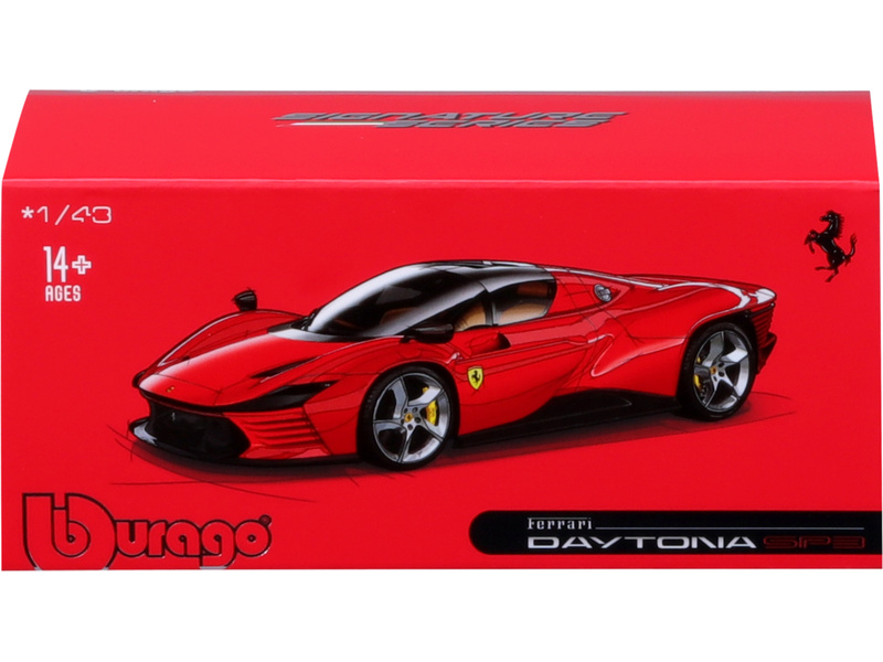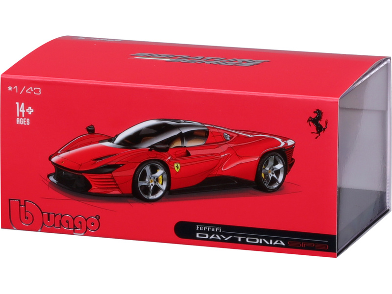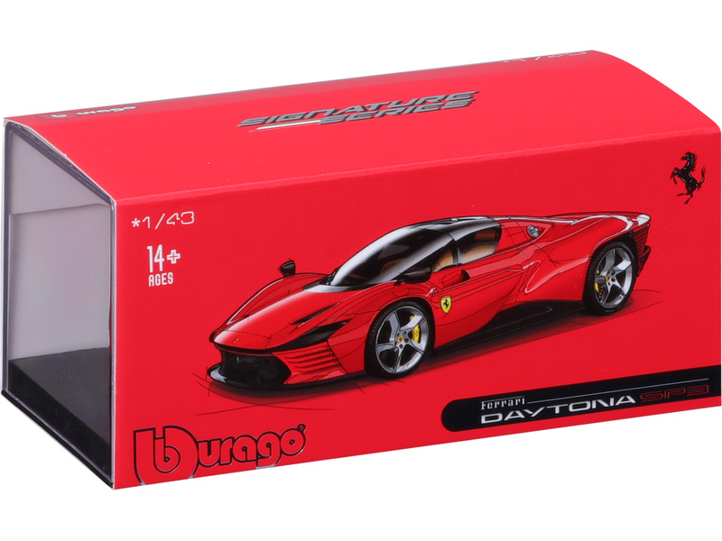 Kovový model auta Ferrari Daytona SP3 v měřítku 1:43 nejen pro sběratele od Bburaga. Detailní provedení, přívětivá cena, barva červená, délka přibližně 10 cm.