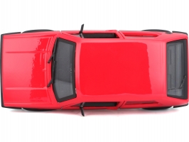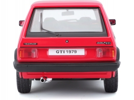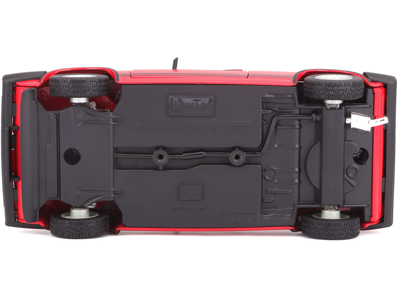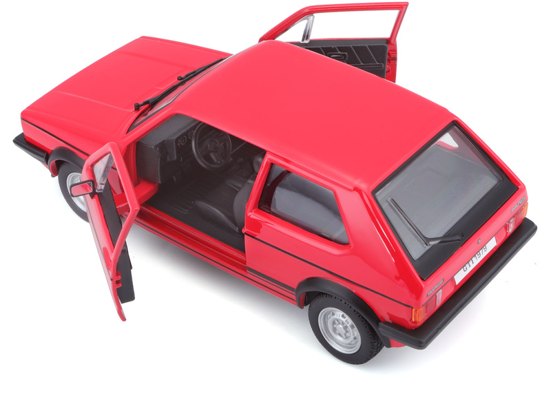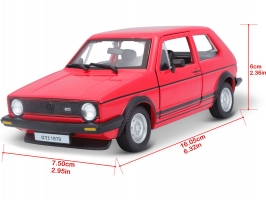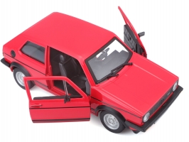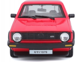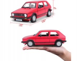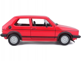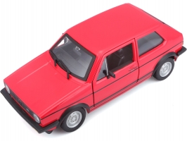 Kovový model auta v měřítku 1:24 Bburago 18-21089 Volkswagen Golf MK1 GTI, nejen pro sběratele. Má otevírací dveře a kapotu, natáčení kol volantem je plně funkční. Barva modelu je červená a je přibližně 16 cm velký.