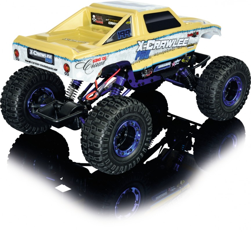 Tento krásně a kvalitně zpracovaný stroj, ultralehký X-Crawlee PRO 1:10 se po rozbalení promění v plně funkční terénní vozidlo s pohonem všech čtyř kol. Díky radikálně sklopeným nápravám, tuhým hnacím hřídelím a šroubovaným pneumatikám s beadlock (šroubovacím) systémem Crawler překonává téměř každou překážku. Model má mnoho modře eloxovaných duralových dílů, jako jsou spojovací tyče řízení, unašeče náprav, šasí. Nastavitelné olejové tlumiče, které snižují hmotnost a společně s robustní polykarbonátovou karoserií vytvářejí opravdu "COOL" vzhled. Silné řídící servo CS-6 s tahem 6 kg a kluličková ložiska. Všechny tyto vlastnosti zaručují neuvěřitelně intenzivní zážitek z řízení.