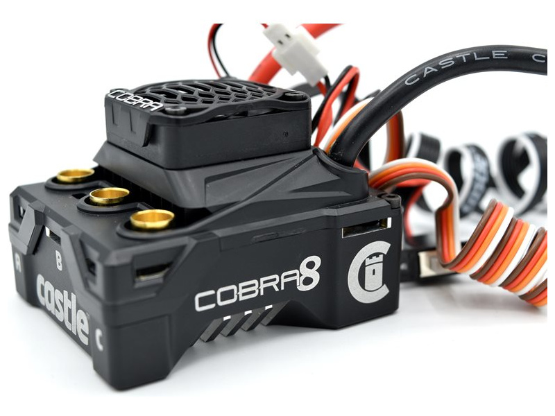Výkonný regulátor otáček Castle Cobra 8 se střídavým senzorovým motorem 1515 2200kv, pro RC modely aut v měřítku 1:8 a 1:10 do hmotnosti 6.8 kg. Napájení 2-6S LiPo, BEC 5-8V (8A). Voděodolná konstrukce, doplňkový vstup pro změny během závodu, záznam naměřených dat. Technologie CRYO-DRIVE.