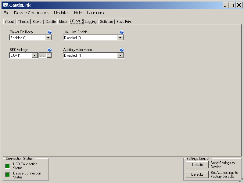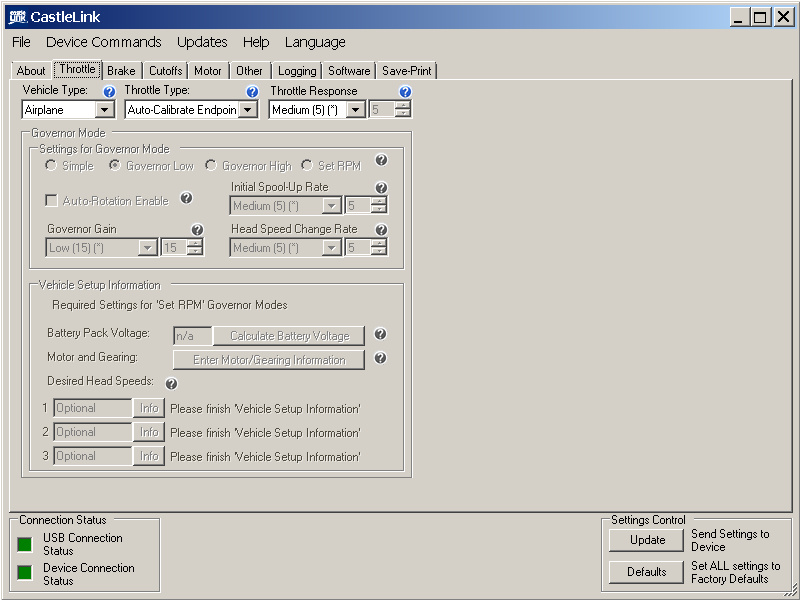 Základní parametry regulátoru lze naprogramovat pomocí plynové páky vysílače nebo programovací kartou. Veškeré parametry regulátoru se pak programují volně dostupnou aplikací Castle Link určené na počítače s operačním systémem Windows. Regulátor se připojuje k počítači přes speciální převodník do USB portu. Pro snazší připojení USB převodníku doporučujeme zakoupit programovací propojku Quick Connect.