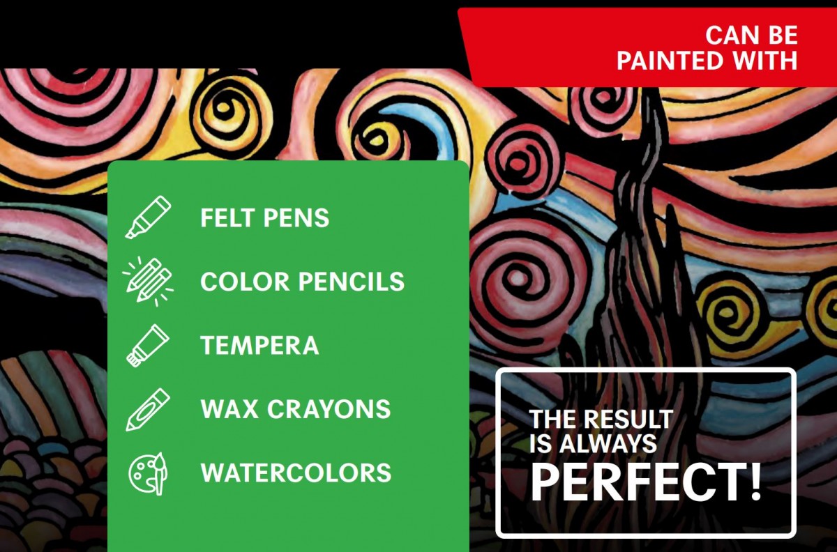 Sametové desky se dvěma obrázky k vybarvení na přední a zadní straně, motiv draka Yin Yang. Vybarvovací šablona je ze sametu, který usnadňuje vybarvení. Obrázek můžete vybarvit fixami, pastelkami nebo voskovkami. Okraje motivu jsou přesně vymezeny sametem a zabraňují přetahování okrajů. Přední strana desek je zobrazena vpravo.