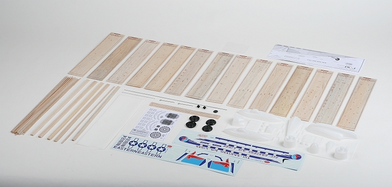 Stavebnice obsahuje: balsové předseknuté díly, balsové nosníky, předseknuté díly z plastikové překližky, vakuově lisované maketové díly (kryt motorů, motory, příď trupu...), plastová kola, ocelovou strunu na podvozek a další drobné díly, potahový papír, aršík mokrých obtisků, stavební plán.