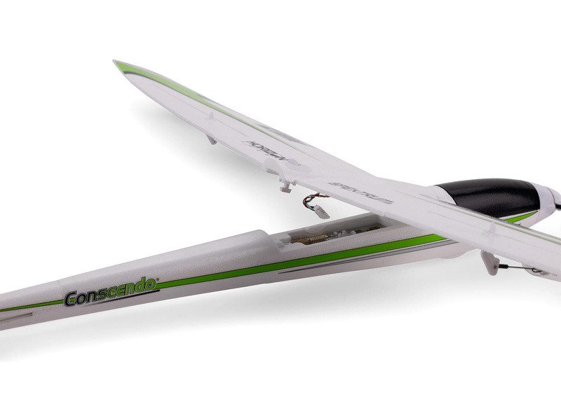 Set UMX Conscendo obsahuje kompletní vybavené díly, připravené k sestavení hned po vybalení z krabice. Jednoduše namontujte jednodílné křídlo bajonetovým šroubem, nainstalujte vlastní nabitou baterii, připojte jej k vašemu 5+ kanálovému vysílači Spektrum vybavenému DSMX/DSM2 a jste připraveni k provozu.