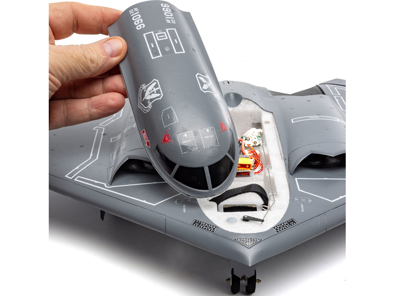 Mikroreplika unikátního ikonického stealth bombardéru jako RC model letadla značky E-flite se dvěma 30mm elektrodmychadly vybavenými výkonnými střídavými motory. Model, za příznivou cenou, nabízí nejen neuvěřitelné maketové zpracování, ale také překvapivý výkon a letové vlastnosti, které jsou ještě vylepšeny stabilizačními systémy AS3X a SAFE Select. Pevný podvozek s řiditelným příďovým kolem usnadňuje pojíždění, vzlet a přistání na hladkém povrchu, nebo můžete podvozek jednoduše demontovat pro maketový let a větší výkon.
