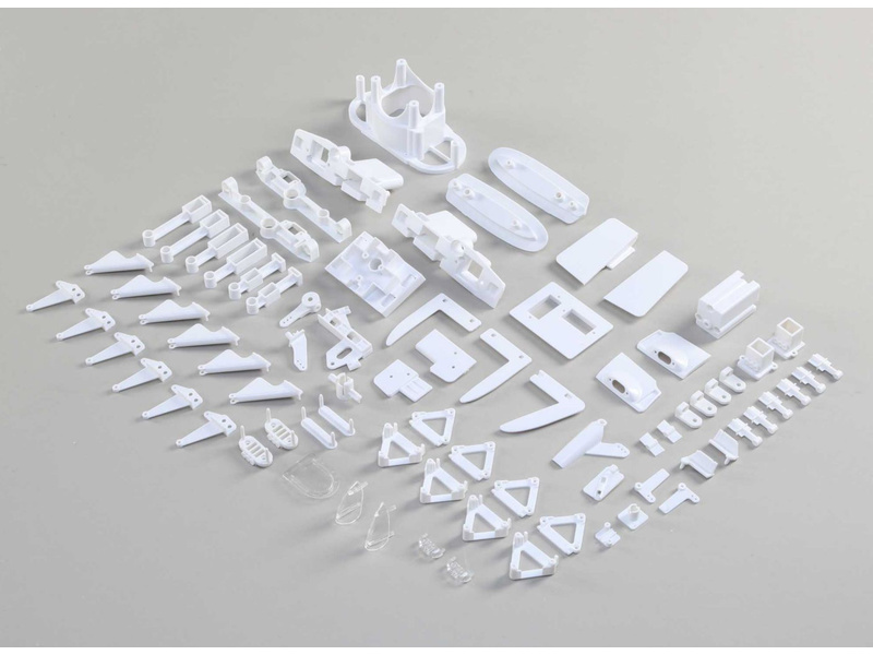 Náhradní díl pro RC model letadla E-flite Cirrus SR-22T 1.5m: soubor plastových dílů, jako páky, krytky, motorové lože a další.