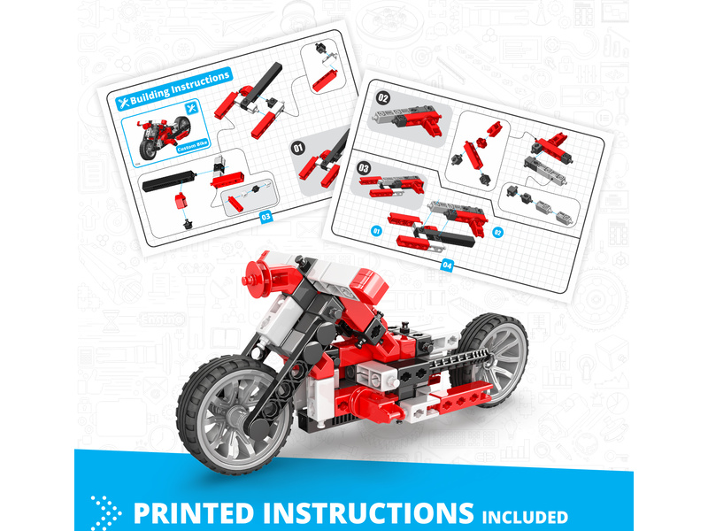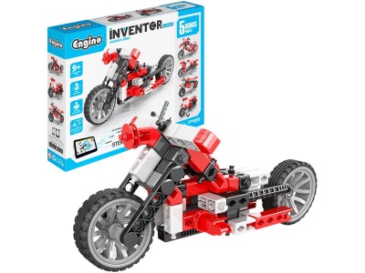 Stavebnice pro děti od 9 let, Engino Inventor motorka, sestavit lze 5 různých typů modelů motorek. Jednoduchá kreativní stavebnice pro děti, s možností využít stávající díly k dalším stavebnicím Engino. Obrázkový přehledný barevný návod.