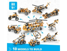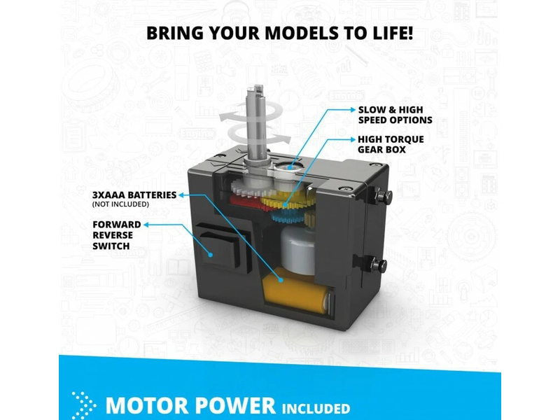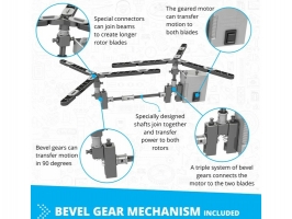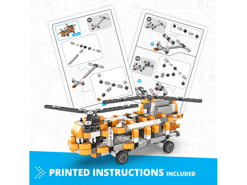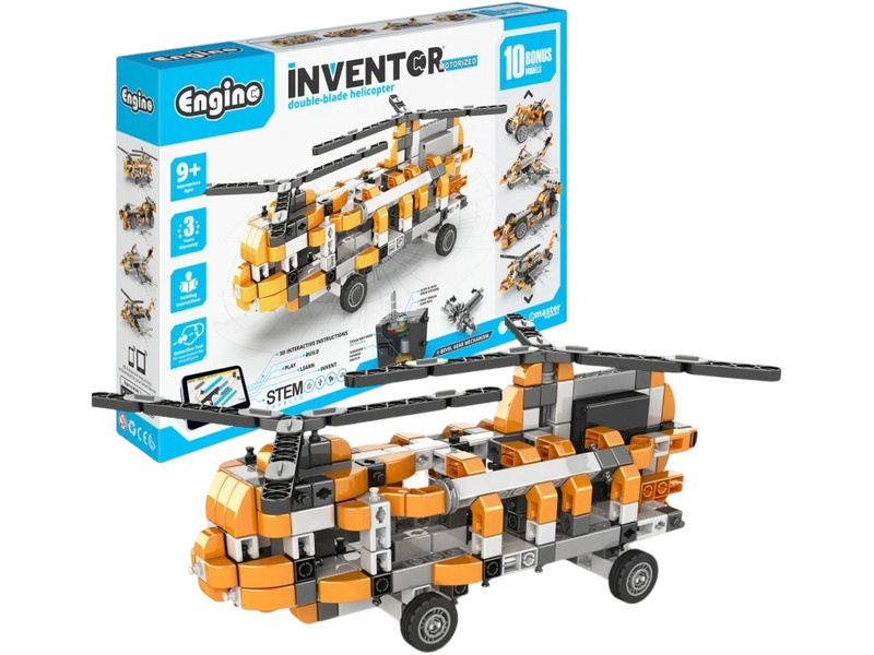 Stavebnice Engino Inventor Motorized vrtulník, sestavit lze 10 různých modelů, jako jsou auta, vrtulník, motorka, stavební stroje, pes apod. Aby se modely pohybovaly, je součástí i pohonná jednotka na baterie s vypínačem. Návody s přesným postupem sestavení a popisem funkcí mechanismů.