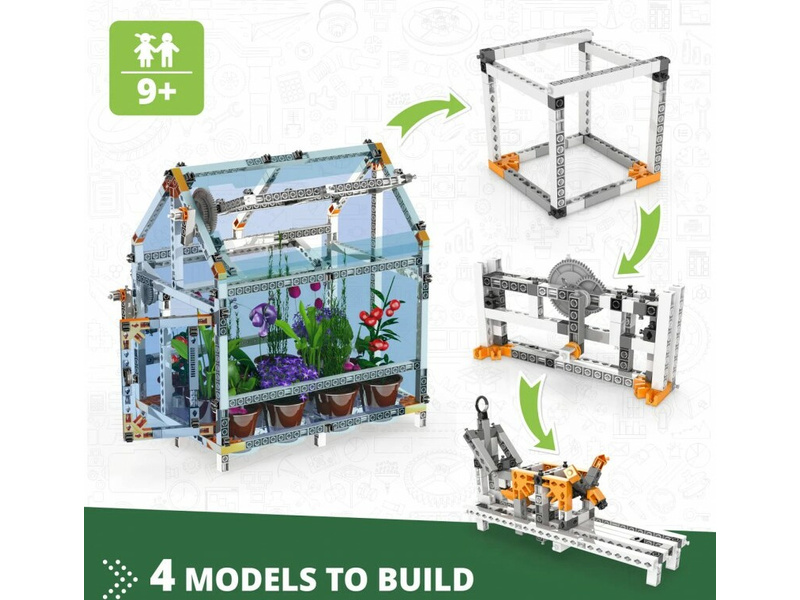 Postavte si tento úžasný, plně funkční model skleníku a uvidíte, jak se vaše semena oplodňují a rostou! Máte zájem stát se mladým pěstitelem rostlin? Ovládejte podmínky uvnitř skleníku pomocí mecanicky ovládaných dvířek a sledujte, jak jsou vaše rostliny ovlivněny teplotou, vlhkostí a úrovní světla. Postarejte se o své rostliny a zajistěte jim správné větrání prostřednictvím pohyblivých částí skleníku. Získejte informace o fotosyntéze a životním cyklu fazolí.